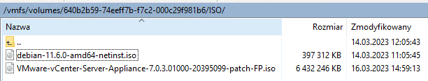Upload downloaded ISO to the datastore using vCenter or connect directly to ESXi host using WinSCP. I used WinSCP and I uploaded ISO to shared datastore: