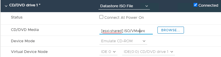 2. In CD/DVD drive section choose Datastore ISO file. Select file window will pop-up, if not click Browse. Select uploaded ISO and click OK. Make sure Connected is checked. Click OK to finish Edit settings.
