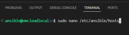 1. Open Terminal on your Ansible VM (or connect by SSH) and edit /etc/ansible/hosts file using the following command:
