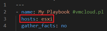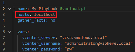 Now you can run Ansible Playbooks with “localhost” as a host. This can be used for any operation in vCenter, just add the following lines to your Playbook: