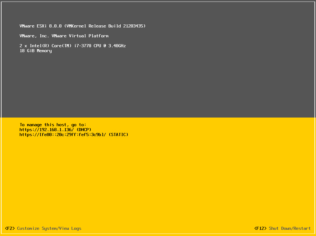 1. Once ESXi is up after installation it is time for the first configuration. Press F2.