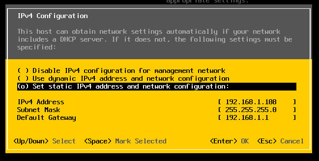5. Select Static IP by using arrow keys and Space. Type your ESXi IP details. Once done confirm by pressing Enter.