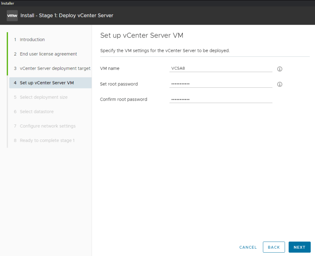 7. Type desired vCenter Server Appliance VM name with new root password. Click Next.