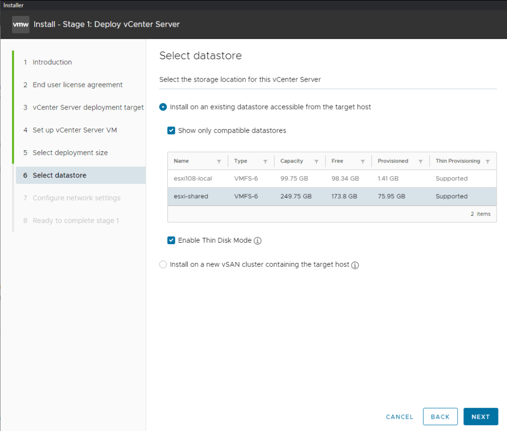 9. Select desired datastore and select Enable Thin Disk Mode. Click Next.