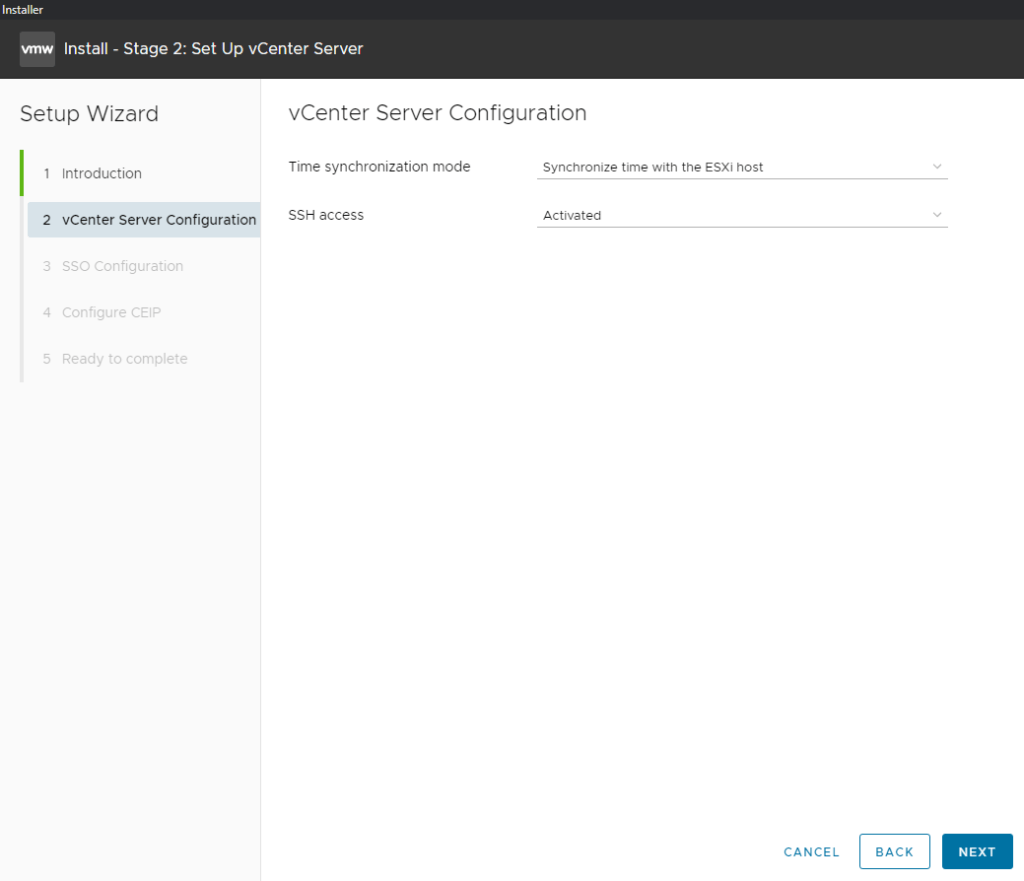 2. Time synchronization mode choose with ESXi. For SSH access it is up to your preferences, SSH access can be enabled anytime after installation.