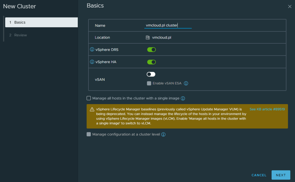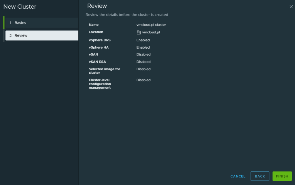 4. Now let’s create a cluster. Right click on your Datacenter and choose New Cluster. Type desired cluster name and choose settings. Click Next and Finish.