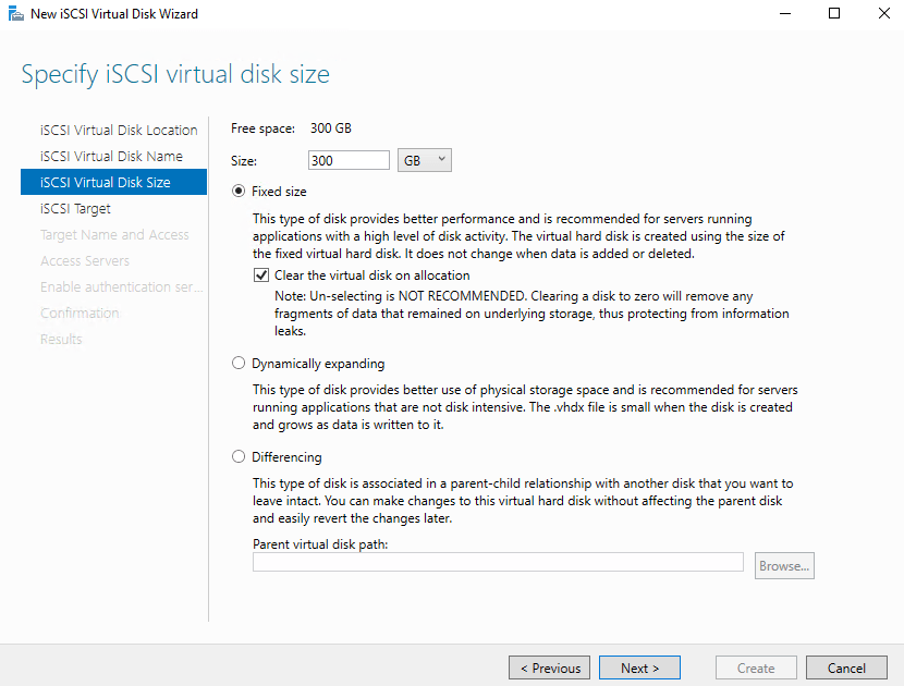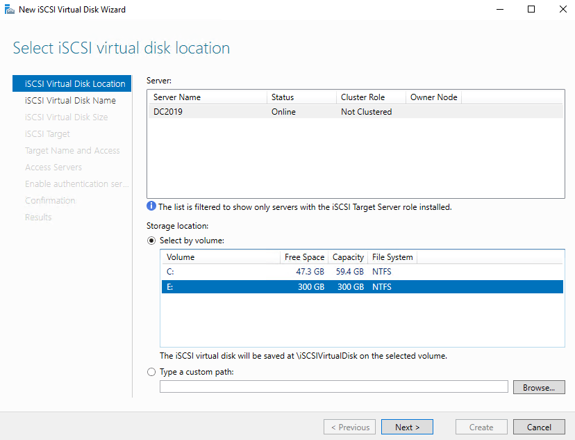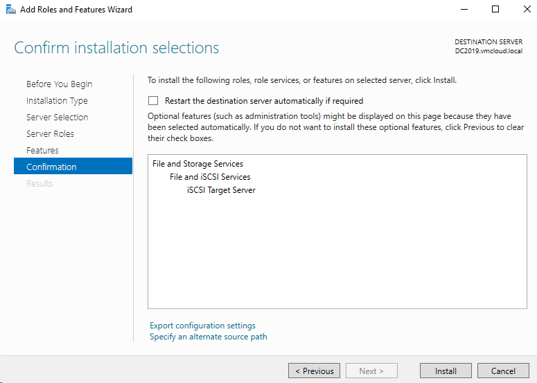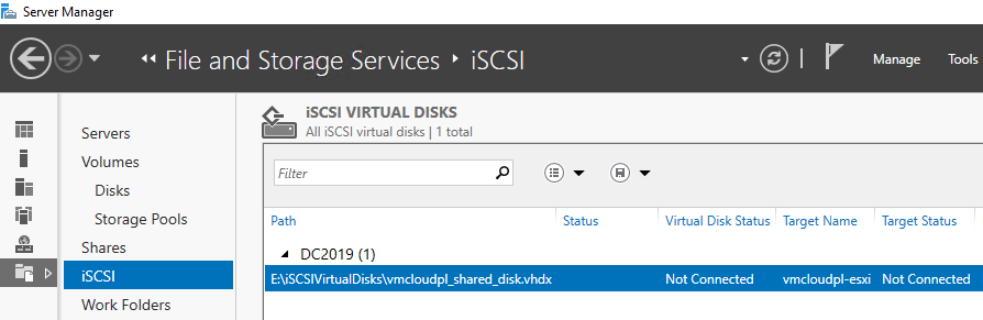 To set up shared storage, I’m going to use Software iSCSI. Therefore, you need to install the iSCSI Target Server role on your VM.