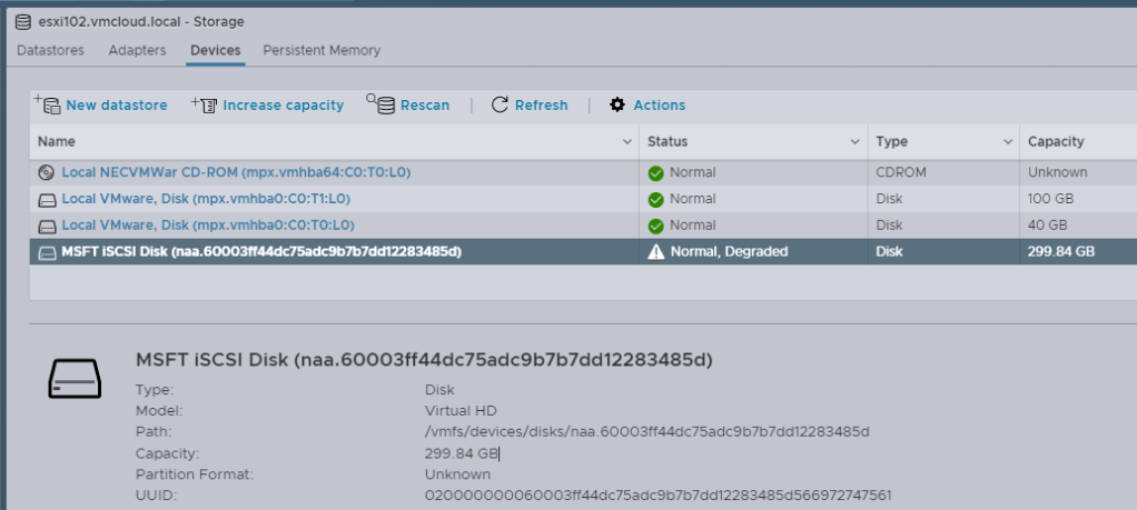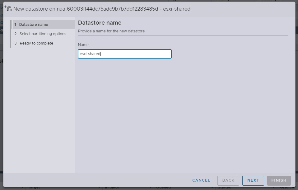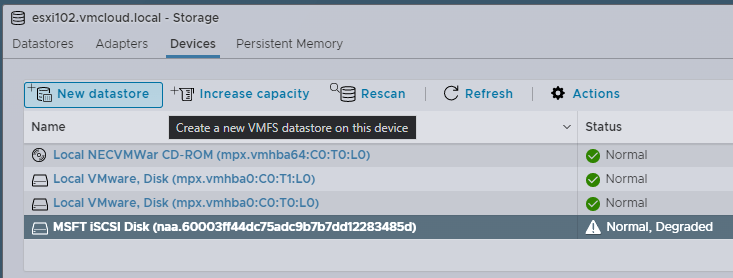 4. Select the iSCSI disk and click New datastore. This datastore will be visible to all ESXi hosts where you add Software iSCSI.