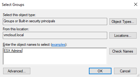 8. Type ESX Admins and click Check Names. Click OK and again OK.