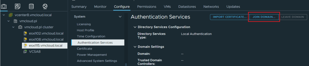 9. Now you have to add ESXi to the domain. In the vCenter choose ESXi, go to Configure and then Authentication Services. Click Join domain on right-hand side.