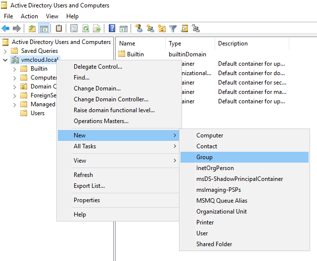 2. Right-click your domain or a folder and choose New, then Group.