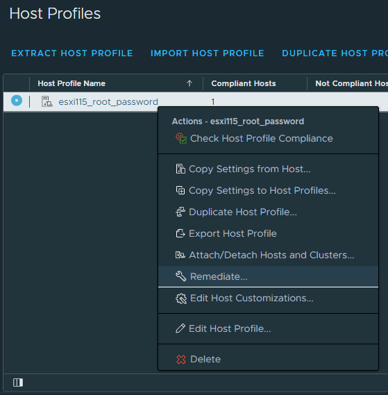 12. In Host Profiles section, right-click on your host profile and choose Remediate. Select your ESXi host, uncheck Automatically reboot hosts and click on Remediate.