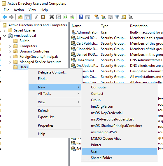4. Now right-click Users folder and choose New, then User.