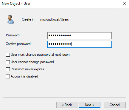 6. Type password. Uncheck “User must change…”. Click Next and Finish.