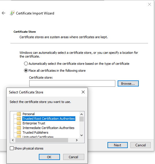 5. Select Place all certificates in the following store, then click Browse and select Trusted Root Certification Authorities. Click OK and Next.