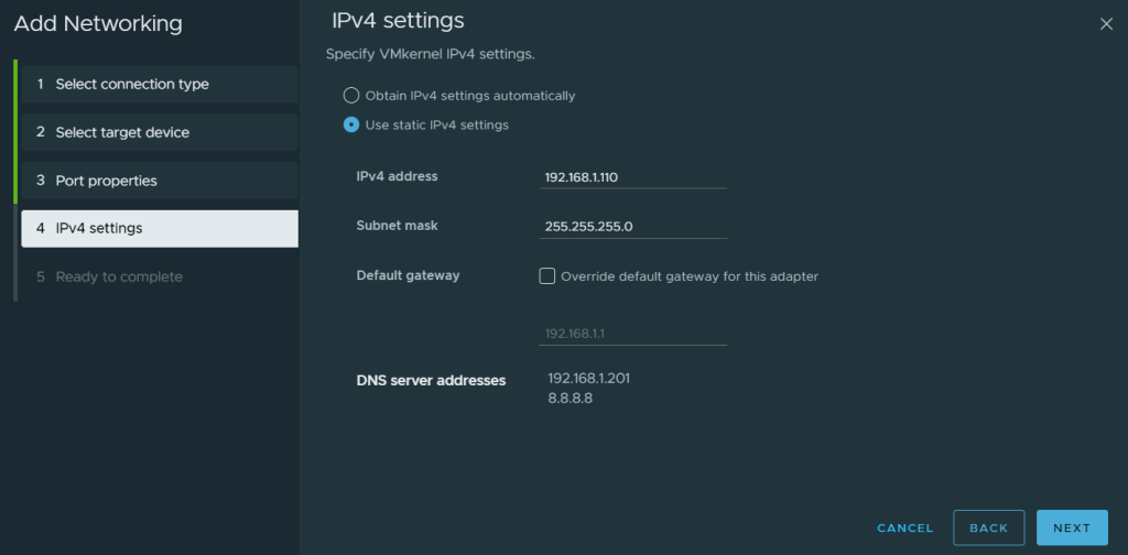 5. In the IPv4 settings, select Use static IPv4 settings and enter your IP with subnet. Each ESXi should have its own IP address for vMotion. Click Next.