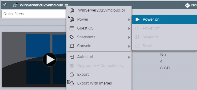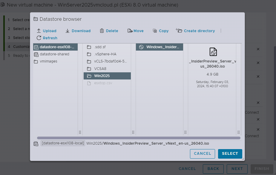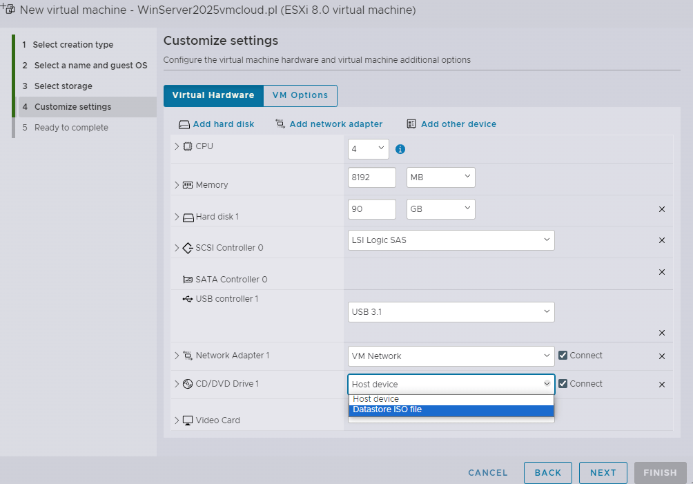 Lets deploy a VM and install Windows Server 2025 operating system. I will create a VM directly on ESXi host, and I will use 4 CPUs with 8GB of RAM.