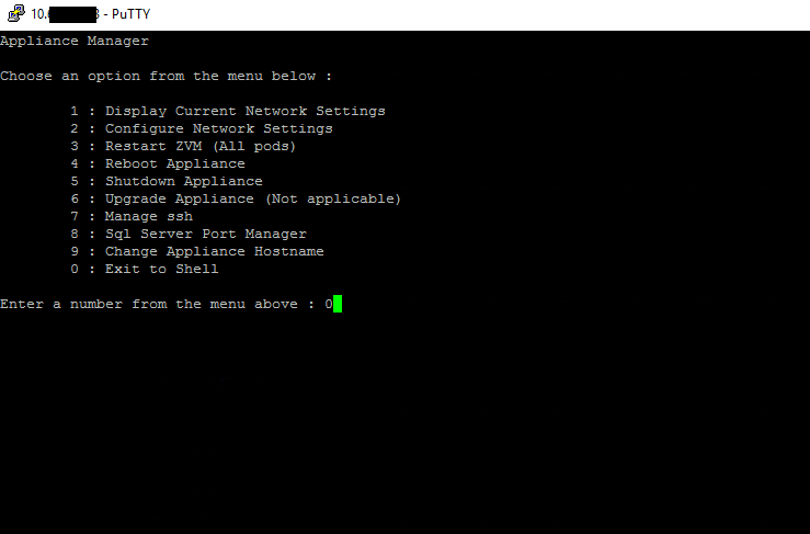 3. In Appliance Manager hit 0 and then hit Enter couple times until you are in Shell. You can also hit Ctrl+C.